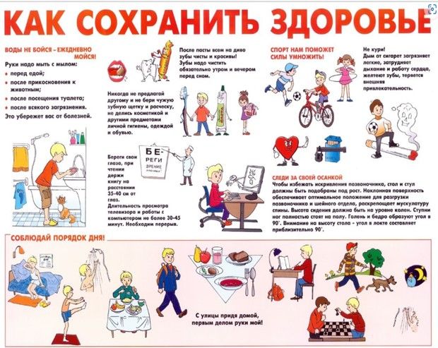 Научите ребенка планировать и контролировать свой режим дня: просыпаться и засыпать в одно время, даже в выходные и праздничные дни, делать утреннюю гимнастику, чистить зубы дважды в день, заботиться о чистоте своей одежды, комнаты. Соблюдение правил личной гигиены – обязательный компонент здорового образа жизни. Содержать свое тело и одежду в чистоте необходимо каждому человеку. Ребенку нужно с самого детства привить понимание о важности регулярного мытья рук с мылом не только перед едой, но и после улицы, общения с животными, после игр.
